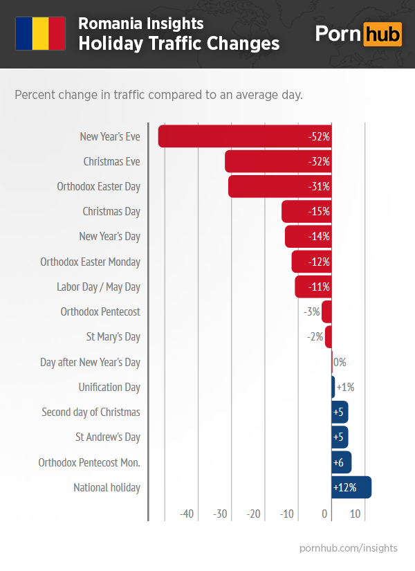 Holidays inevitably affect Pornhub traffic in any given country as these days often mean that people are spending time with loved ones, celebrating or traveling, which inhibits them from spending time on Pornhub. Even better, holidays sometimes simply mean that folks have a day off allowing them to spend a little more time on the world’s #1 adult site. In Romania, New years Eve is the day with the most sizable traffic drop at 52%, comparable to the 53% and 54% drops observed in Russia and the UK respectively on the same holiday. Orthodox Easter is also a major holiday in the country, as attested to by it’s 31% drop, though it would seem that the National Holiday celebrations tend to take place on Pornhub as made evident by the considerable 12% increase in traffic noted on this day.