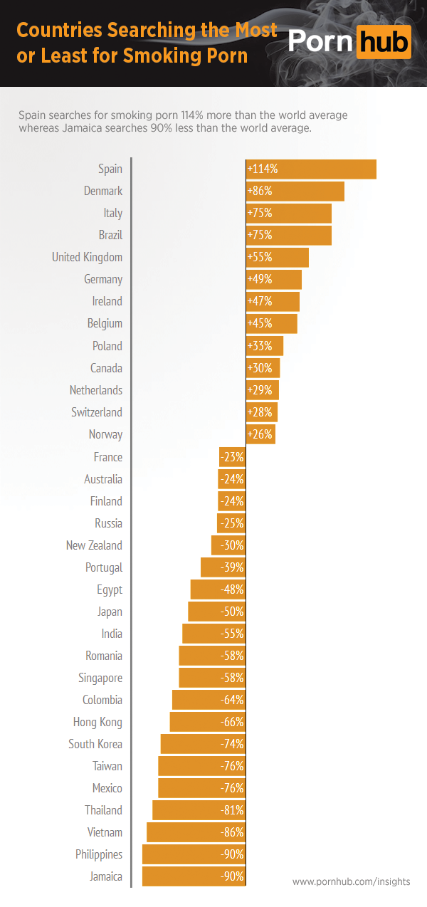 We’ll end off here with a look at which countries search most and least for smoking porn. At the top of the list here are many countries which we have profiled in the past, such as Spain, Denmark, Italy and Brazil, which all featured ‘smoking’ as a top searched term overall when we were analyzing their specific search trends.