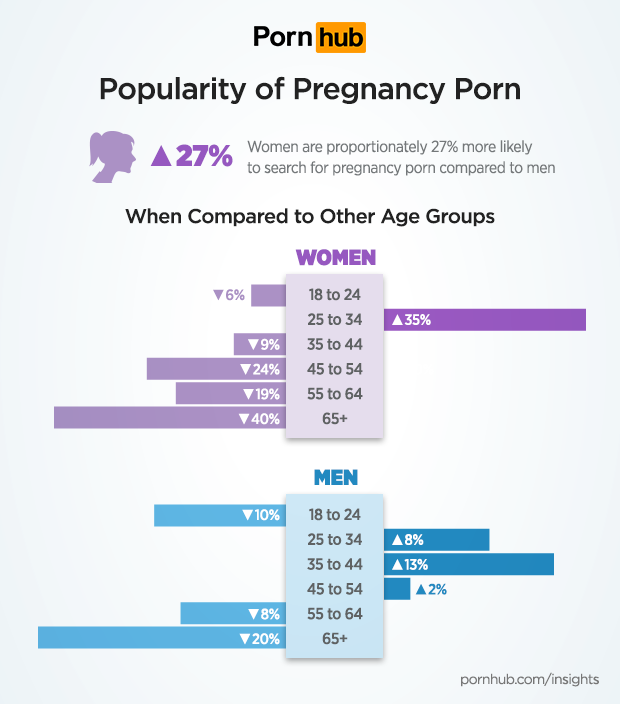 Our statisticians found that women were proportionately 27% more likely to search for pregnant related porn compared to men. Women in the 25 to 34 age group were much more likely to search compared to all other female age groups. Among men, the most pregnant related searches come from 35 to 44 age group.
