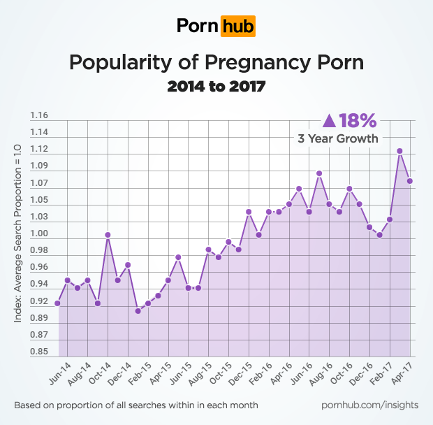 Pornhub Insights has already revealed that moms and MILFs are both extremely popular searches, but many Pornhub visitors also find expecting moms to be equally enticing. Along with our friends at Vocativ, our statisticians discovered that since June of 2014, ‘pregnant’ related searches have grown by nearly 20% in the United States, with peak searches happening in March of 2017.