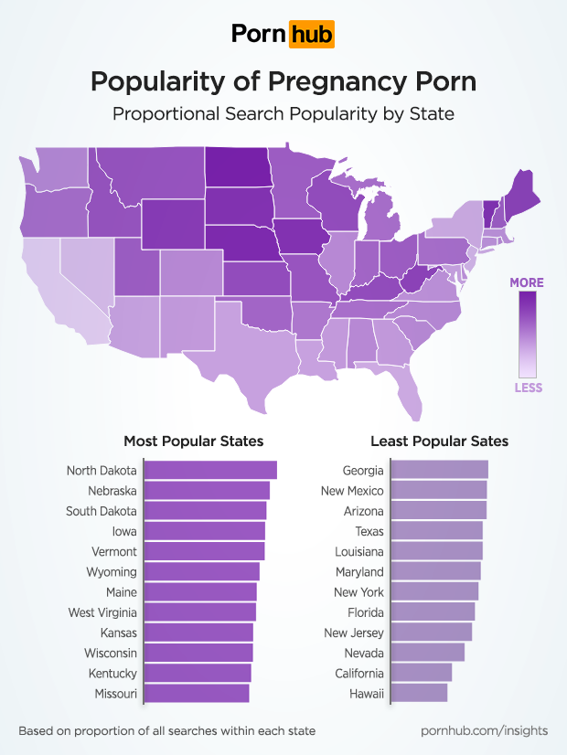 Across the U.S., the states proportionately most likely to search for pregnant related porn were North Dakota, Nebraska and South Dakota — All of which also rank in the top 5 states for fertility rates. The least likely to search for pregnant porn were Hawaii, California, Nevada, New Jersey and Florida.