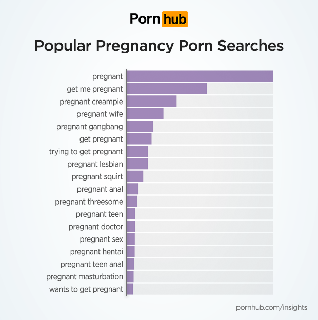 Currently, ‘pregnant’ ranks as the 107th most popular search in the United States, making it roughly equal to “redhead” and “babysitter” searches — the latter being an interesting parental parallel. Some of the most popular related searches include “get me pregnant”, “pregnant creampie” and “pregnant wife”.
