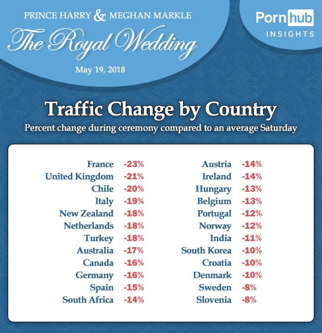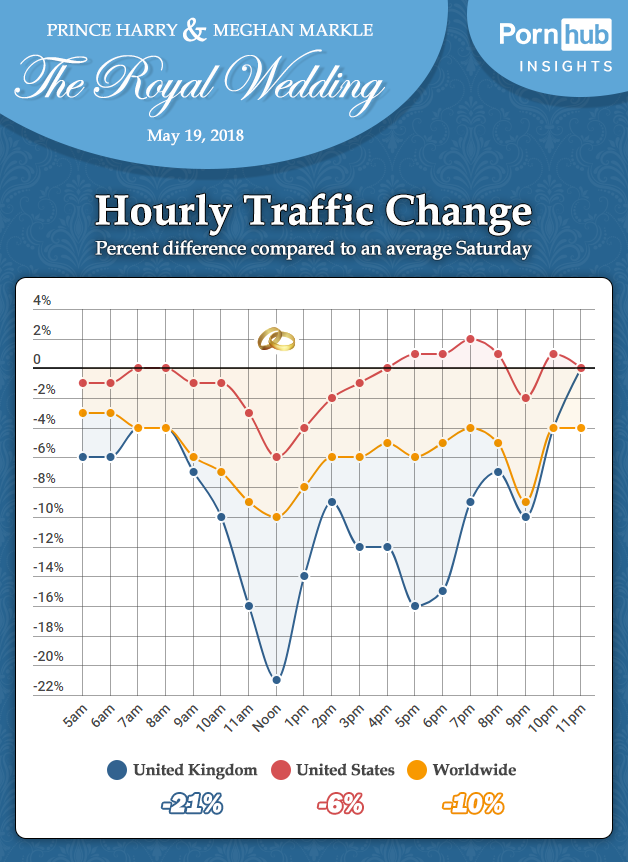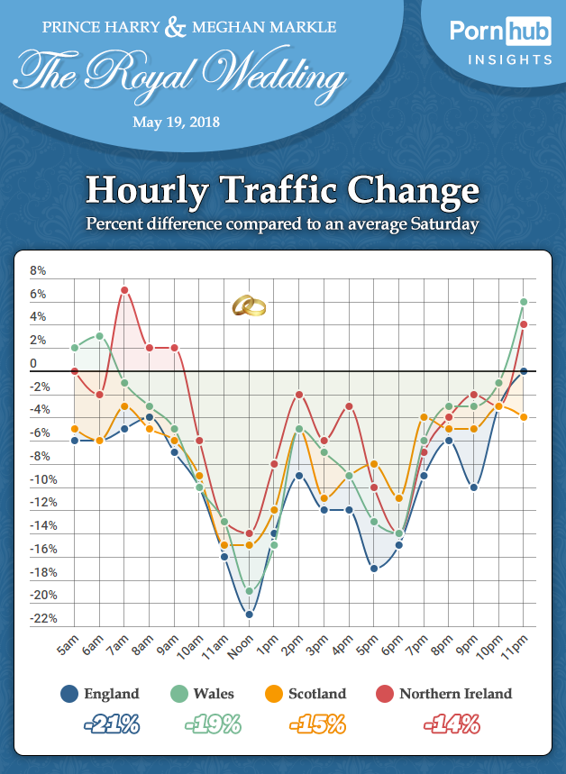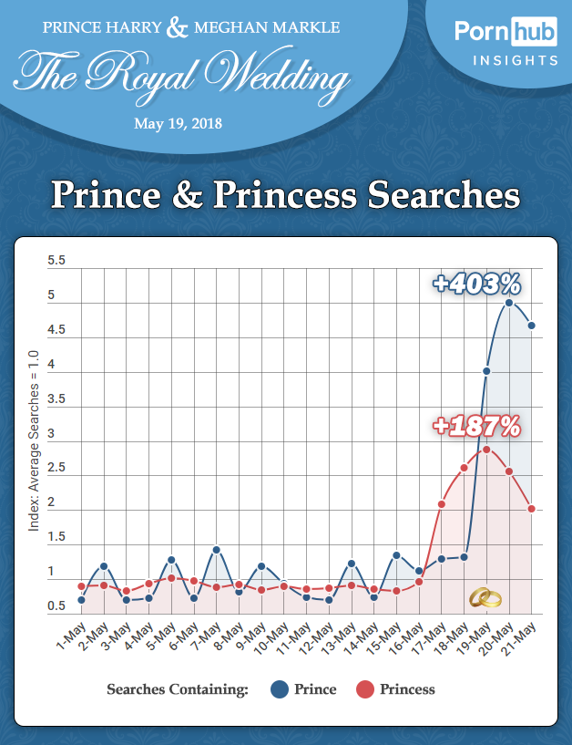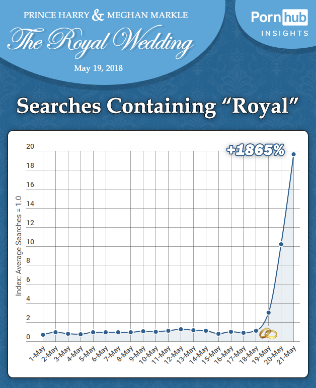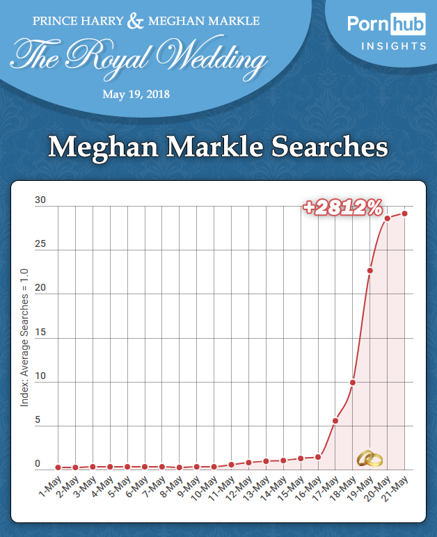 It seems like just the other day that Prince Harry announced his engagement and Pornhub Insights revealed that Searches for Meghan Markle shot up by 2208%. In fact that was only last November, and their romance culminated with a fairy tale wedding at Westminster Abbey on May 19th.
