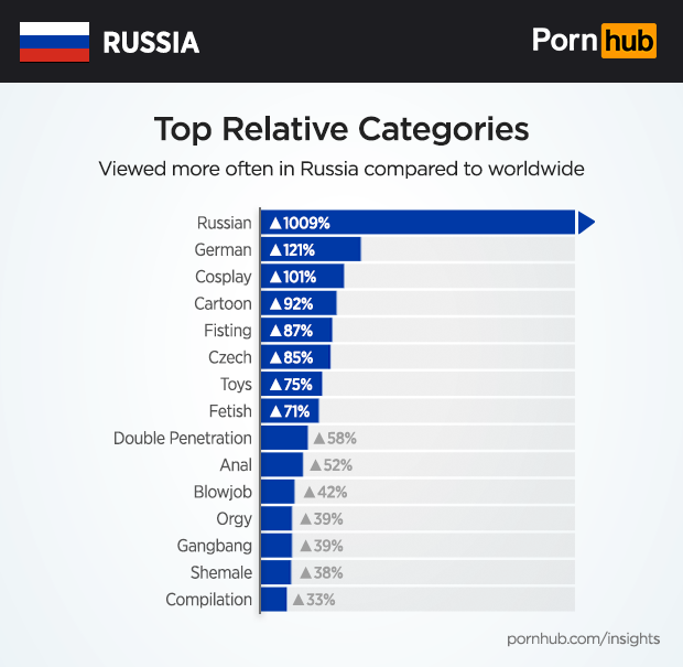 When compared to the rest of the world, Russians are 1009% more likely to view the “Russian” category, and more than 100% more likely to view the “German” and “Cosplay” categories.