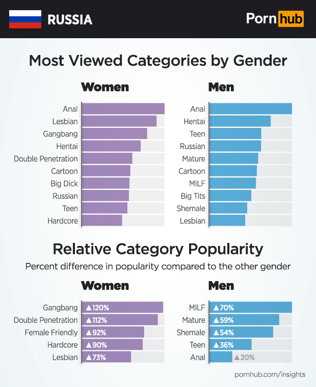 “Anal” is the most viewed category for both men and women in Russia, however in second place women tend to prefer viewing “Lesbian”, while men are more into “Hentai”. When it comes to relative popularity, women are 120% more likely to view “Gangbang” compared to men, and 112% more for “Double Penetration”. Men are proportionately 70% more likely to view “MILF” and 59% more for “Mature”.