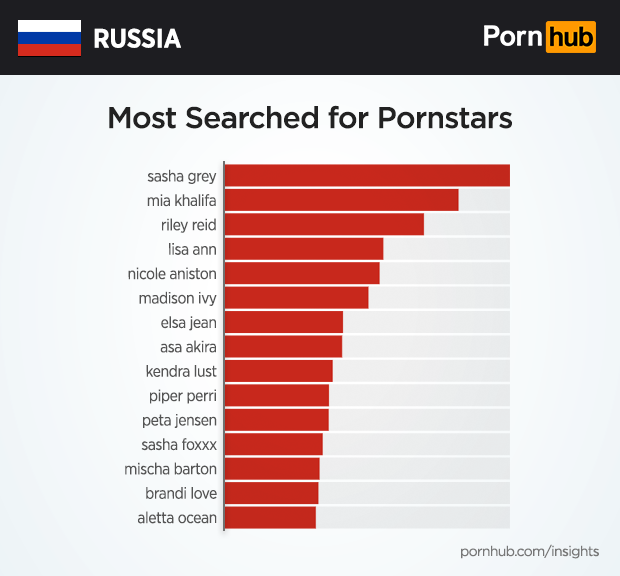 The most searched for pornstar in Russia is Sasha Grey, followed by Mia Khalifa and Riley Reid.