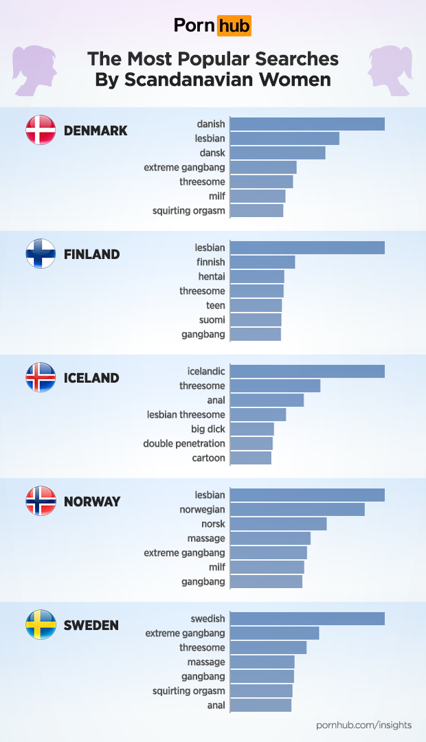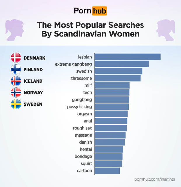 Like elsewhere in the world, Scandinavian women search more often for “lesbian” porn, followed by “extreme gangbang”. Searches for “Swedish” come in 3rd, and “Danish” also makes the list of top searches across the region.