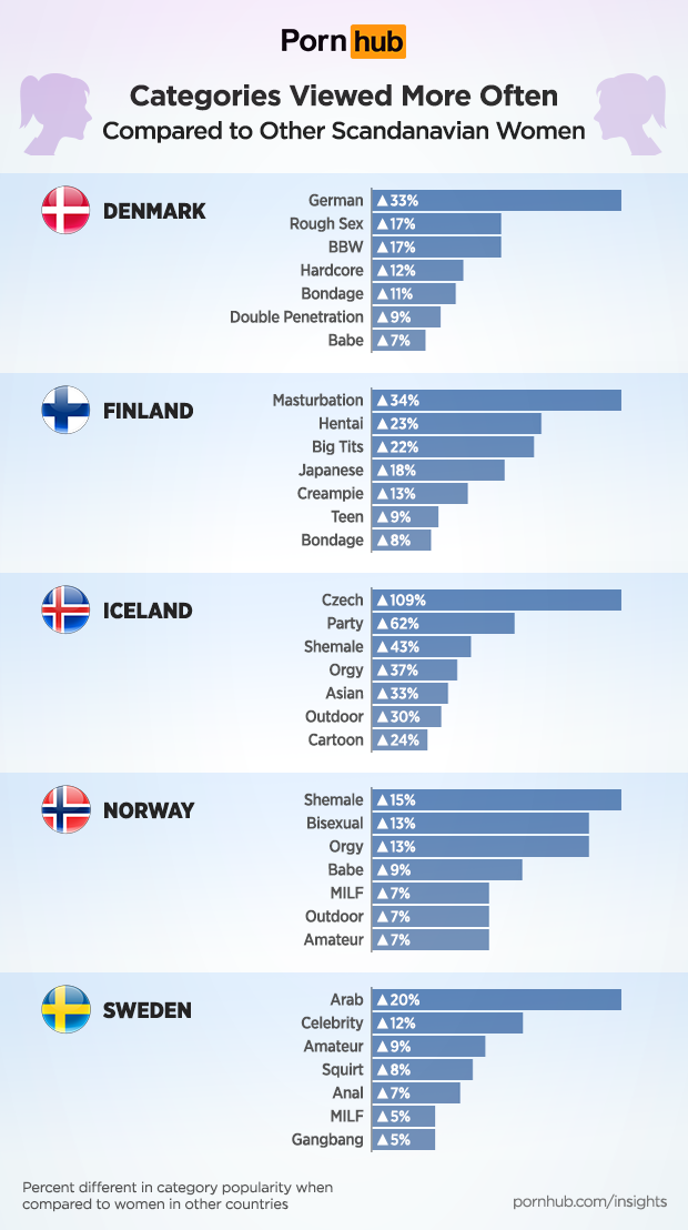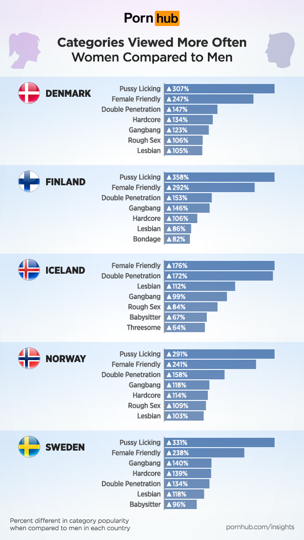 27% of Pornhub’s visitors from Sweden, Norway and Iceland are women — matching the worldwide average. In Finland, 26% are female, and Denmark 25%.