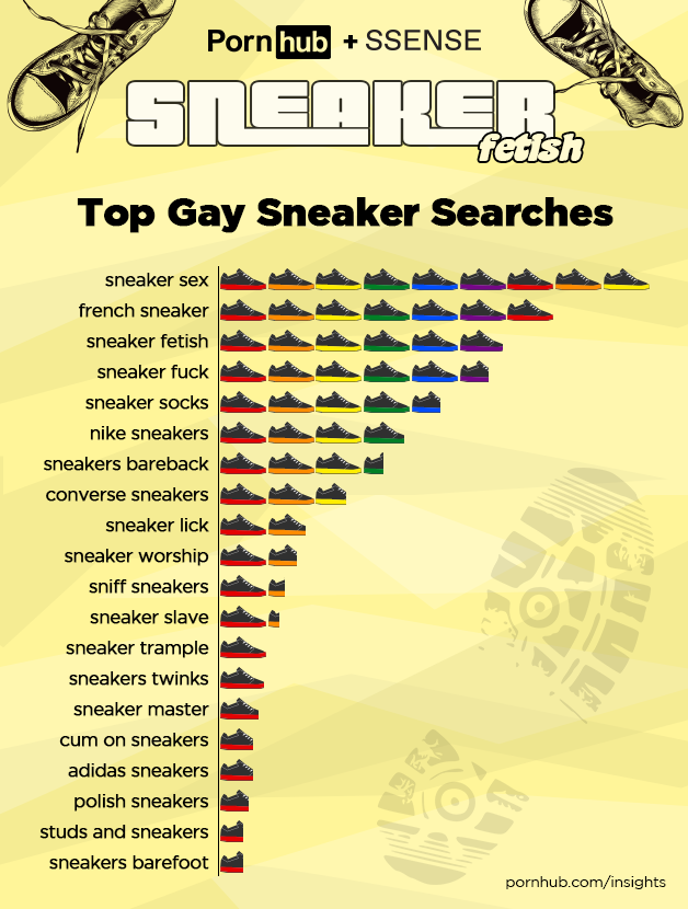 Because gay men seem particularly interested in sneakers, our statisticians looked at Pornhub Gay searches to see how they compared. The number one gay search is “sneaker sex” followed by “french sneaker”.