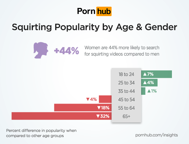 Women are 44% more likely to search for squirting videos compared to men, while the popularity of squirting decreases with age. Visitors between the ages of 18-24 are 7% more likely to search when compared to all other age groups, while those over the age of 65 are proportionately 32% less likely to be interested in squirting videos.