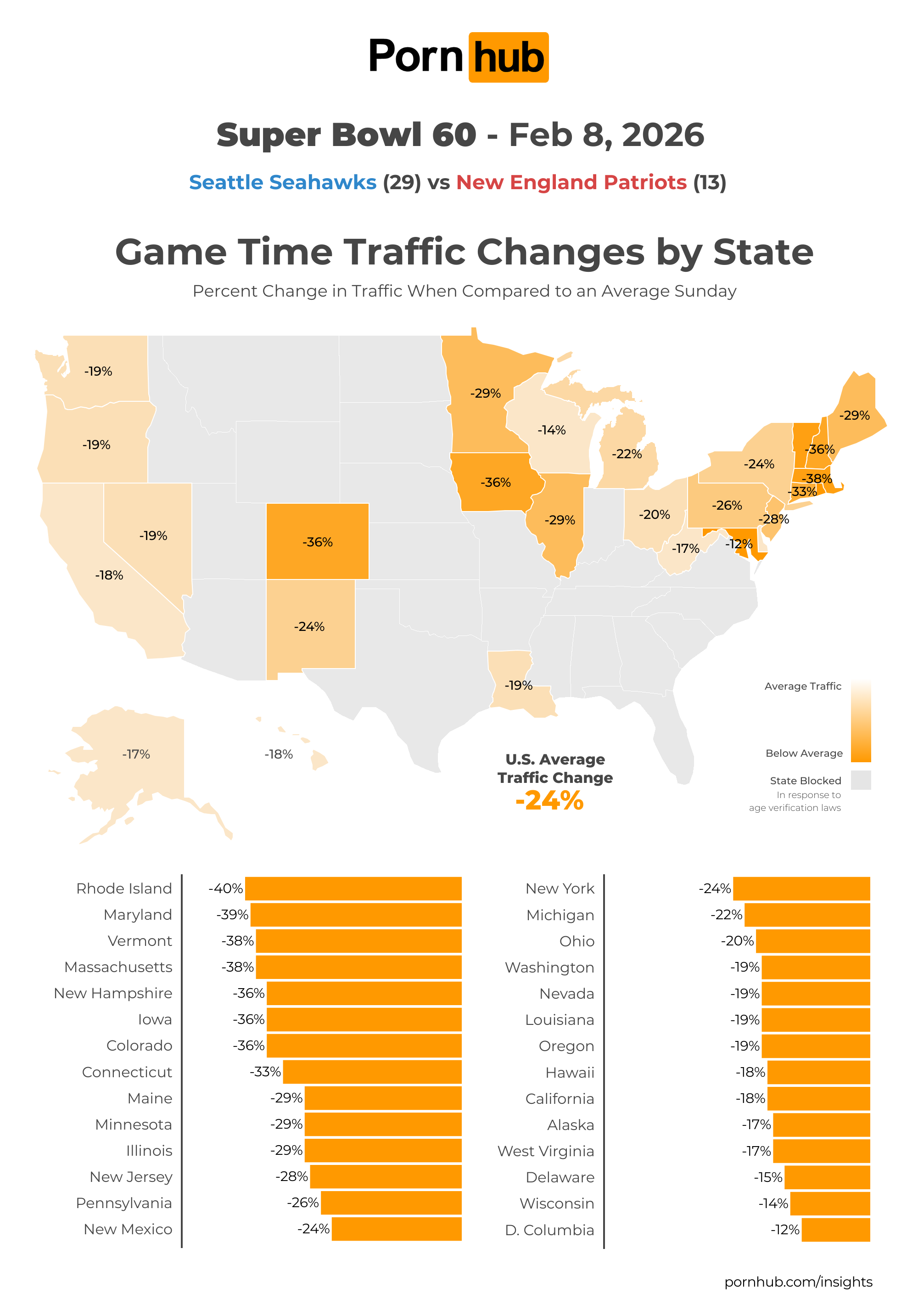Some states showed their patriotism and love of the American tradition that is football a little harder than others. Despite this game involving teams from Massachusetts and Washington, you might not have guessed it from their traffic changes. In Massachusetts, traffic dropped –38% below average, and in Washington, traffic only dropped –19%.