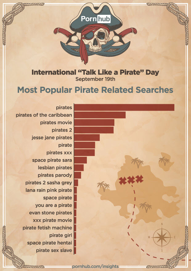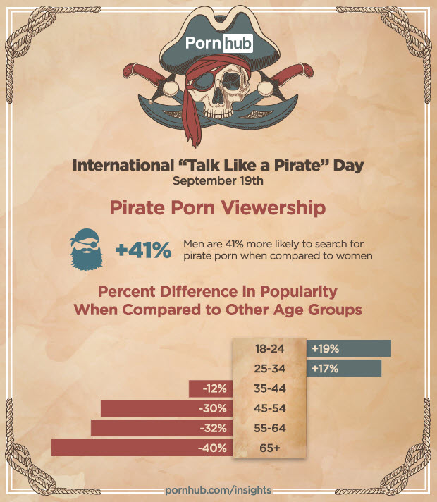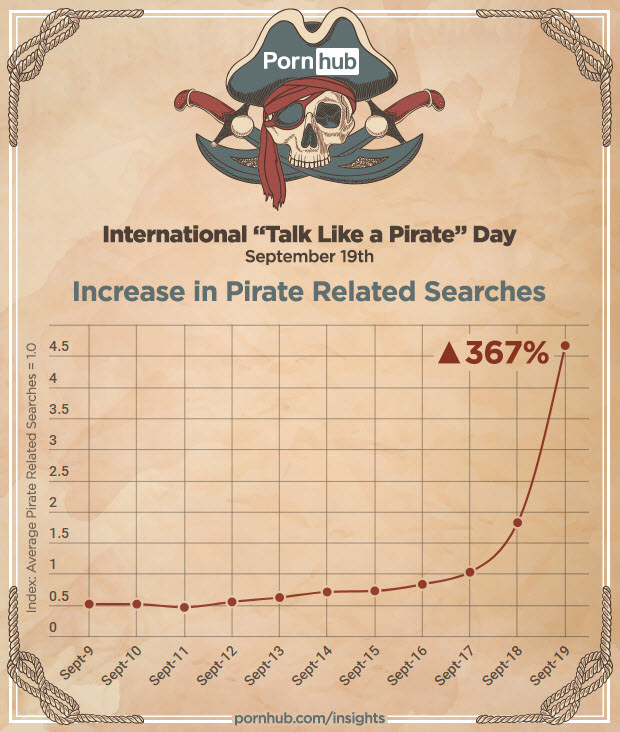This year, “Talk Like a Pirate Day” set sail with more observers than ever, and when our friends at Mashable checked in to see what bounty of Pornhub searches we could find, we soon discovered a 367% increase in pirate related searches on September 19th!