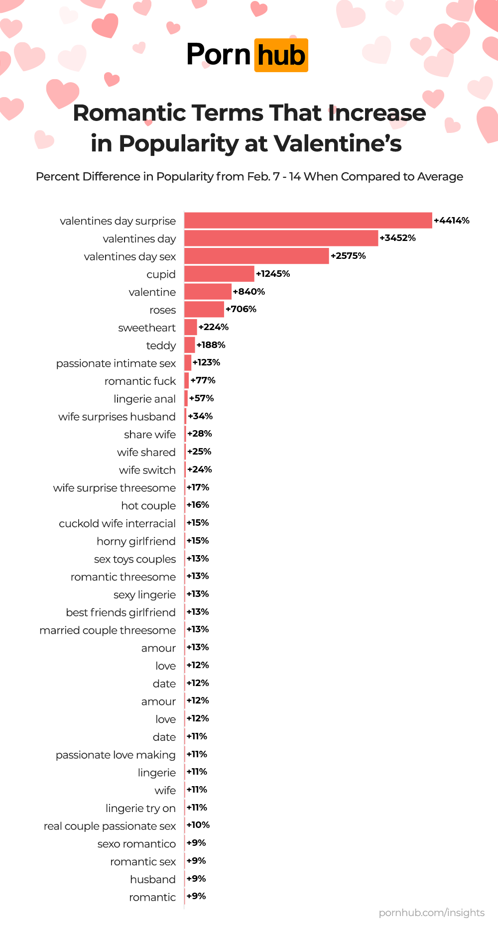 Additionally, other non-Valentine’s specific terms such as “roses” was up +706%, “sweetheart” was up +244%, “passionate intimate sex” was up +123%, “wife surprises husband” was up +34%, “romantic threesome” was up +13% and “love” was up +11%.