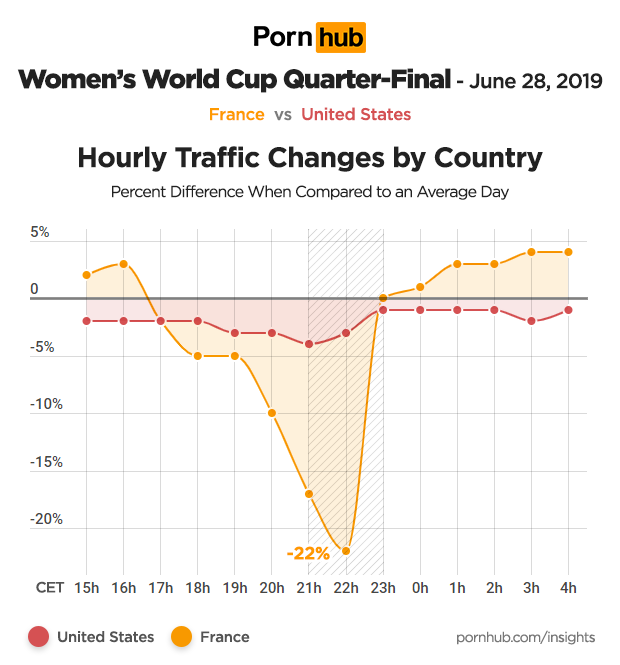 The United States wasn’t as engaged as France, but the day’s traffic level was already slightly below average before, during and after the match. With the United States being Pornhub’s highest traffic country, it takes a major dip in viewers to register a noticeable percent decrease, but we can still see a very slight change at 21h when the match began.